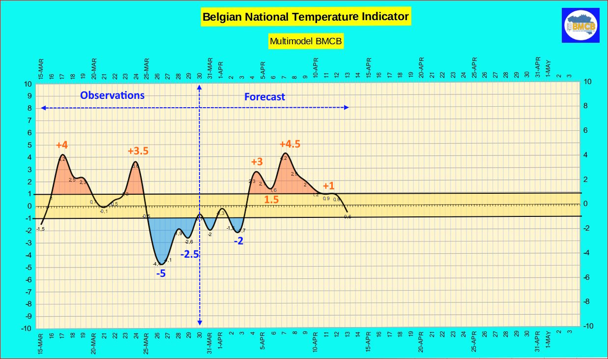 D'ici au 3 avril, l'indicateur thermique national belge devrait néanmoins rester légèrement déficitaire, évoluant encore entre -2 et 0. Dans ce contexte, les températures diurnes demeureront relativement fraîches pour la saison, généralement comprises entre 5 et 12°C selon les régions.