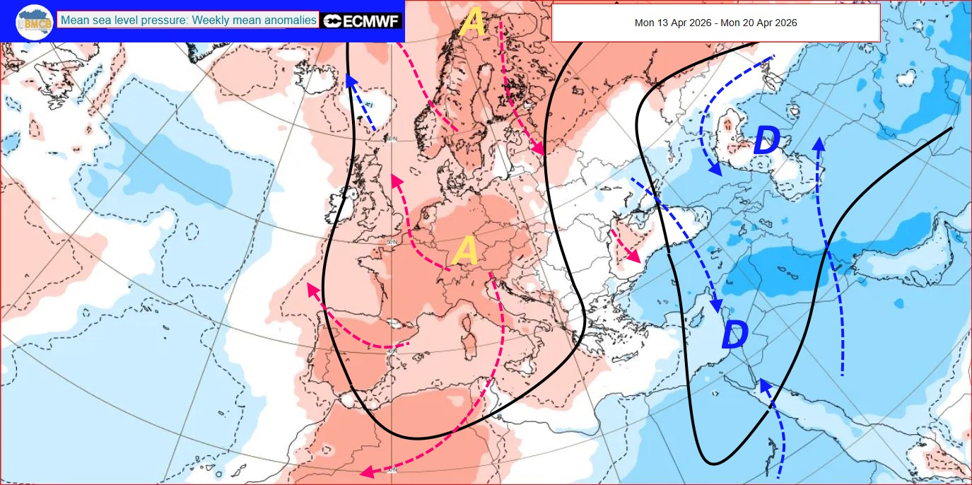 Les dernières projections à l'échelle de la moyenne troposphère mettent en évidence l'installation probable d'un vaste bloc anticyclonique s'étendant des régions polaires vers l'Allemagne, puis jusqu'à l'ouest du bassin méditerranéen. Parallèlement, une zone dépressionnaire devrait progressivement s'organiser entre l'Égypte et la mer Caspienne.