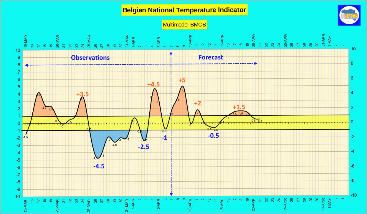 L’indicateur thermique national poursuivra sa hausse dans les prochains jours pour atteindre un maximum entre le 8 et le 9 avril, avec une valeur proche de +5. Cette évolution se traduira par des températures diurnes particulièrement douces, comprises entre 17 et 23°C sur l’ensemble du territoire belge.