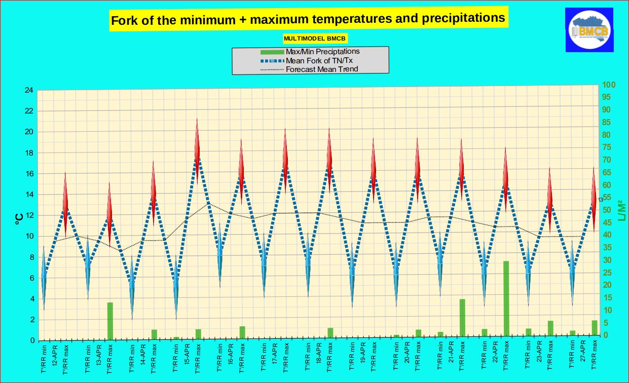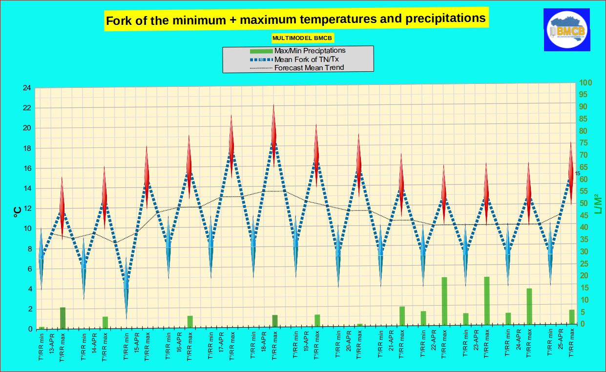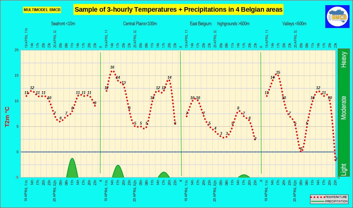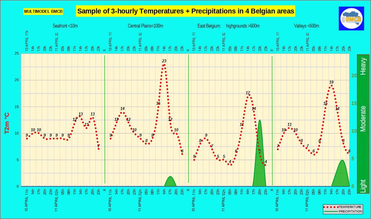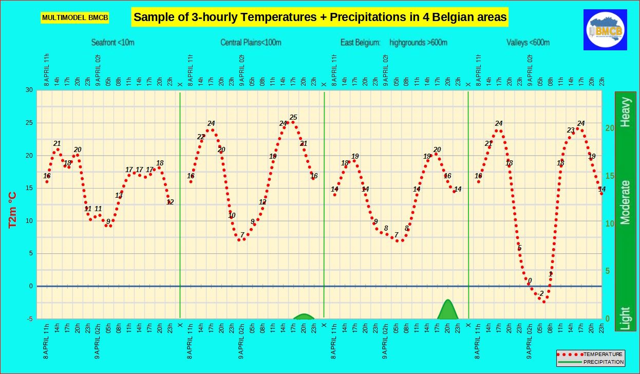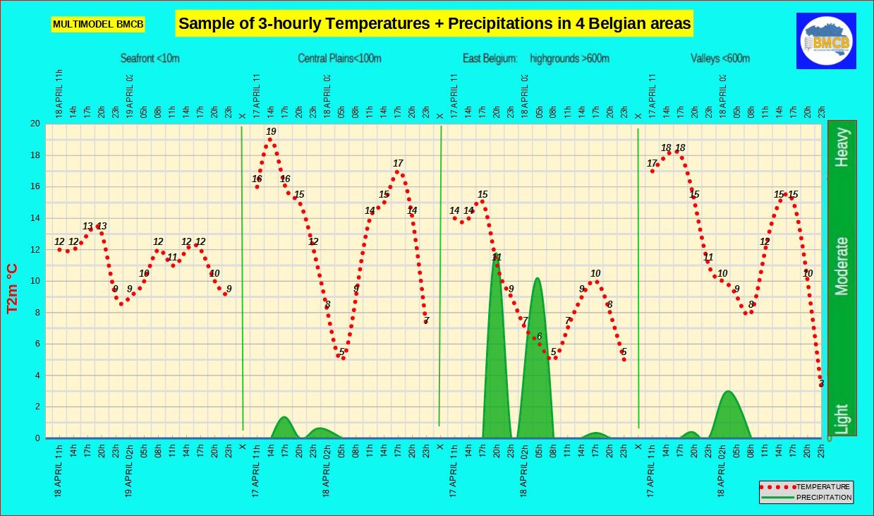 Prévision de la fourchette des températures , les précipitations + type de temps général en Belgique