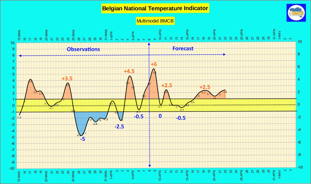 Le pic de douceur attendu ce 9 avril constituera l'épisode le plus marqué de la période, avec un indicateur thermique national atteignant +6 et des températures diurnes comprises entre 18 et 25°C sur l'ensemble du territoire belge.