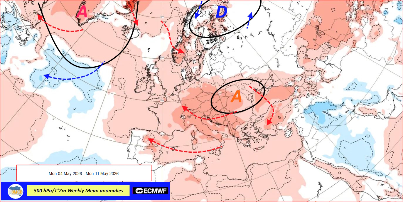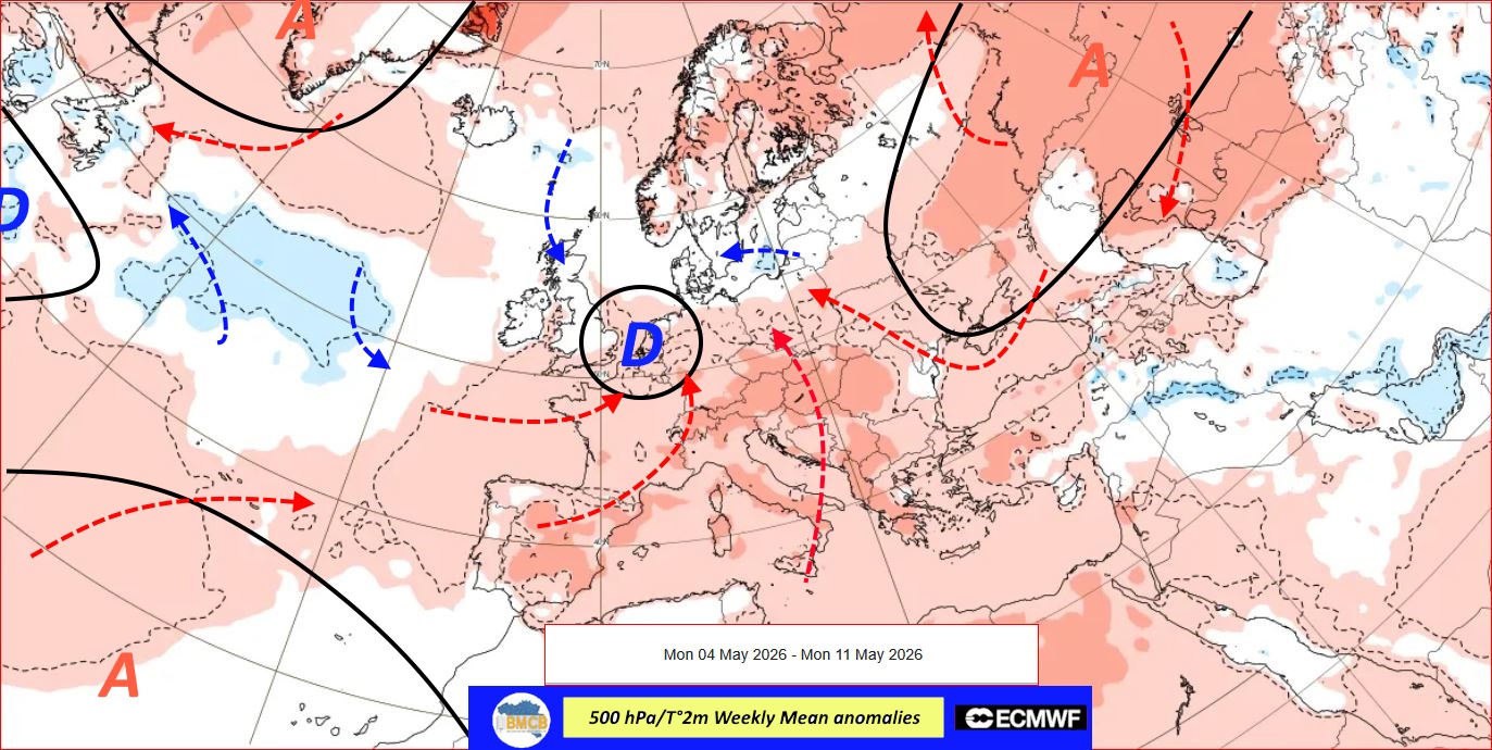 Pour la période du 4 au 11 mai, les hautes pressions se maintiendraient à la fois sur le Groenland et le nord de l'Atlantique, ainsi que sur l'est de l'Europe. Nos régions resteraient alors sous l'influence d'un flux de sud-est très doux à chaud.