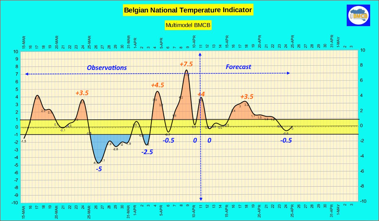 L'indice thermique remonterait alors temporairement entre +2 et +4, ce qui correspondrait à des températures diurnes comprises entre 15 et 22°C sur le territoire belge.