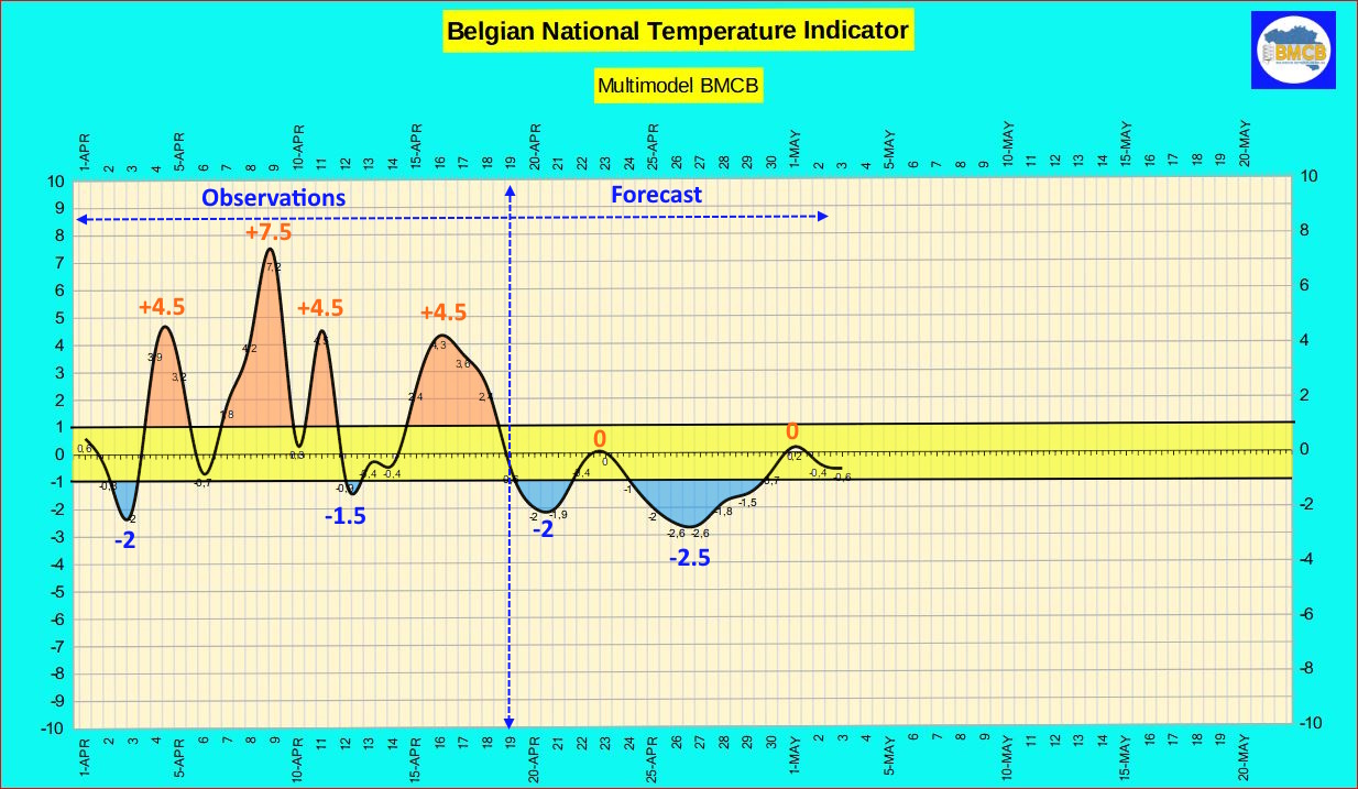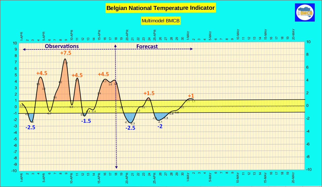 Un net rafraîchissement s'amorce à partir de ce week-end. L'indicateur thermique national belge repassera en territoire négatif, avec des valeurs proches de -2 à -3 attendues autour des 20 et 21 avril, traduisant une fraîcheur sensible. Dans ces conditions, les températures maximales ne dépasseront généralement pas 8 à 15°C l'après-midi.