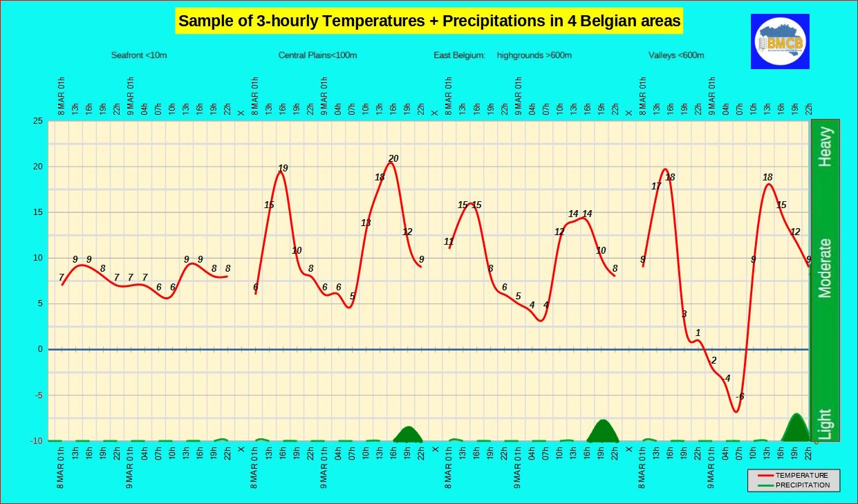 Ochtendmist, vooral in de vlakten. Daarna vrij zonnig en zeer zacht. Tegen de avond neemt de kans op lokale regen of buien toe in het westen van het land. 's Nachts opnieuw mistvorming, vooral ten zuiden van de Samber-Maas-as.