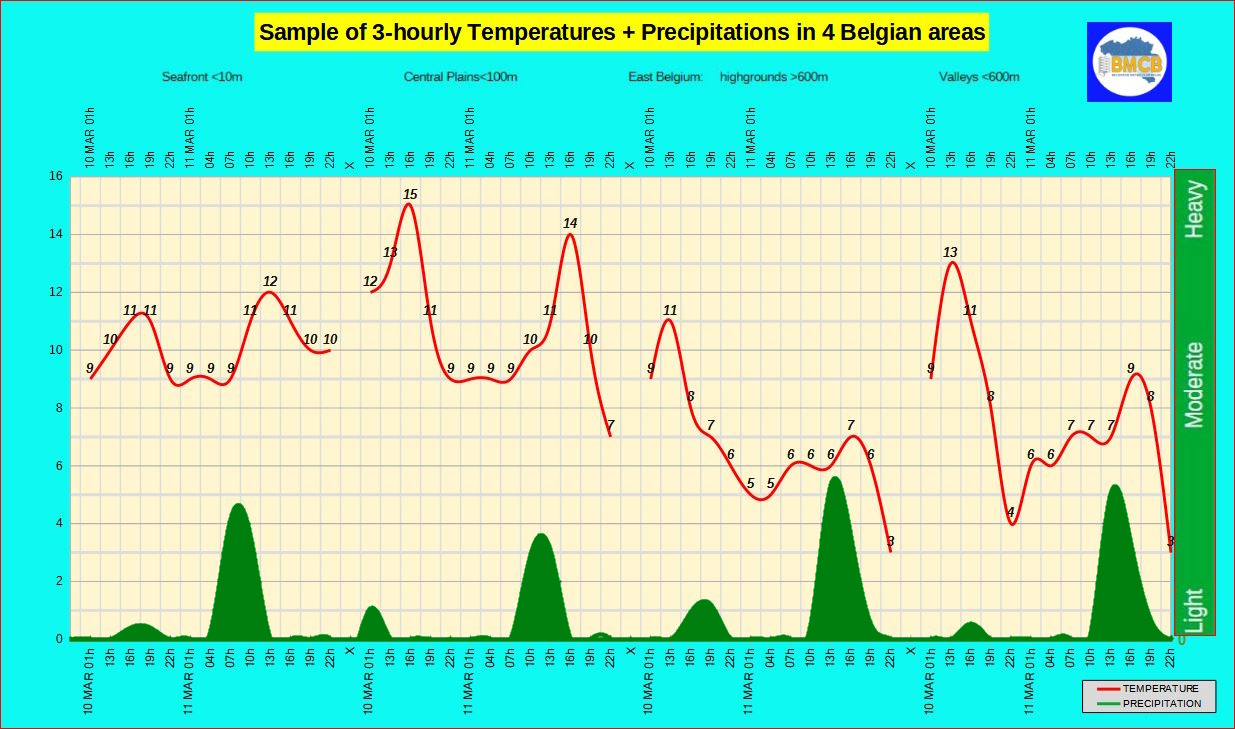 - Maxima: ±11°C aan zee, 14–15°C in het binnenland, 10–13°C in de Ardennen.