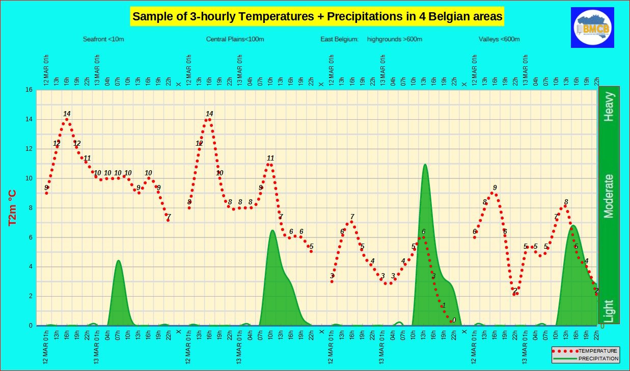 Regen vooral in Limburg, Luik, Namen en Belgisch Luxemburg. Elders wisselvallig met tijdelijke opklaringen en nog enkele buien, behalve in West-Vlaanderen waar het meestal droog blijft.