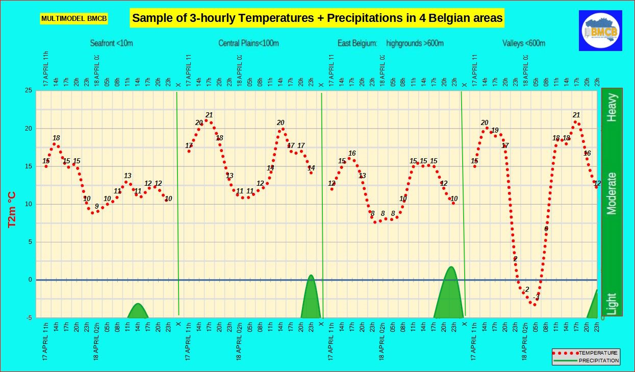 Tegen de avond brede opklaringen in Vlaanderen en het westen, maar elders bewolkt met buien, mogelijk onweerachtig. Temperaturen rond 11-12°C aan zee, 9-14°C landinwaarts en 11-15°C ten zuiden van Samber en Maas.