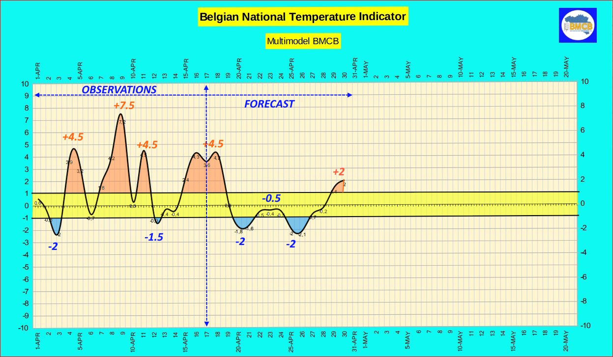 Deze zachtere fase is echter van korte duur. Vanaf zondag daalt de index snel en schommelt vervolgens tussen 0 en -2, een trend die minstens tot 28 april aanhoudt, waarna een geleidelijke stijging naar positievere waarden wordt verwacht.