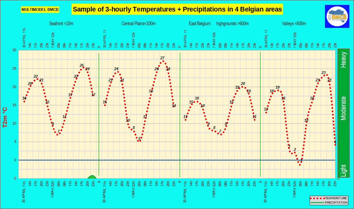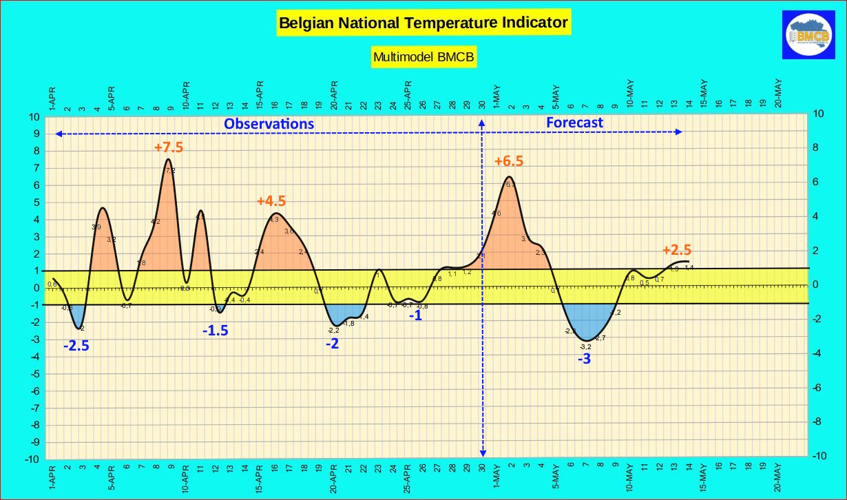 De Belgische nationale thermische index stijgt duidelijk en bereikt een piek aan het begin van het weekend van 1 mei, met een waarde rond +6. Deze evolutie gaat gepaard met een uitgesproken opwarming, waarbij de maxima in het hele land oplopen tot 20-27°C.